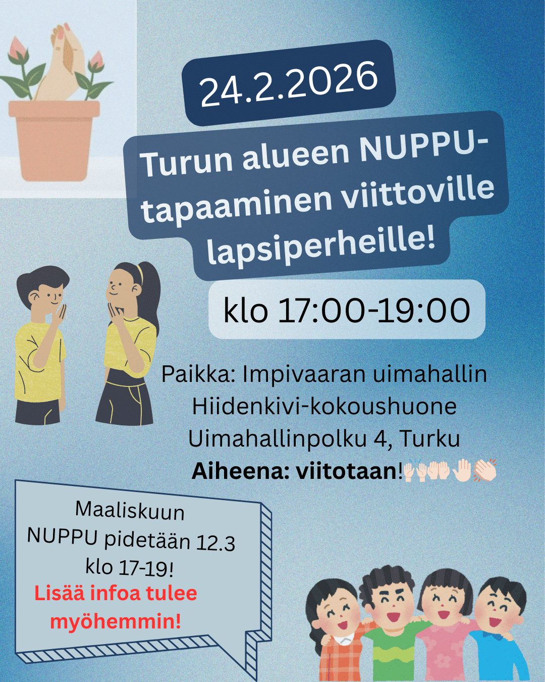 Huom! Maaliskuun NUPPU-tapaaminen on jo varattu ajalle torstai 12.3. klo 17–19. Tästä tulee lisää infoa myöhemmin.